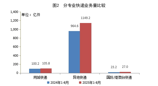 1-8月,邮政行业寄递业务量累计完成1399.2亿件,同比增长15.5%。其中,快递业务量累计完成1282.0亿件,同比增长17.8%。分类型看,同城快递业务量累计完成105.8亿件,同比增长5.6%;异地快递业务量累计完成1149.2亿件,同比增长19.1%;国际/港澳台快递业务量累计完成27.0亿件,同比增长16.2%,各类型业务均呈现增长态势。