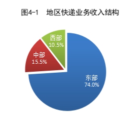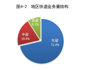 1-8月,同城、异地、国际/港澳台快递业务量分别占全部快递业务量的8.3%、89.6%和2.1%。与去年同期相比,同城快递业务量的比重下降0.9个百分点,异地快递业务量的比重上升0.9个百分点,国际/港澳台业务量的比重基本持平,显示出业务结构的调整。1-8月,东、中、西部地区快递业务收入比重分别为74.0%、15.5%和10.5%,快递业务量比重分别为71.4%、19.4%和9.2%。与去年同期相比,东部地区快递业务收入比重下降0.8个百分点,快递业务量比重下降1.4个百分点;中部地区快递业务收入比重上升0.5个百分点,快递业务量比重上升0.9个百分点;西部地区快递业务收入比重上升0.3个百分点,快递业务量比重上升0.5个百分点,体现了区域发展的不平衡性。