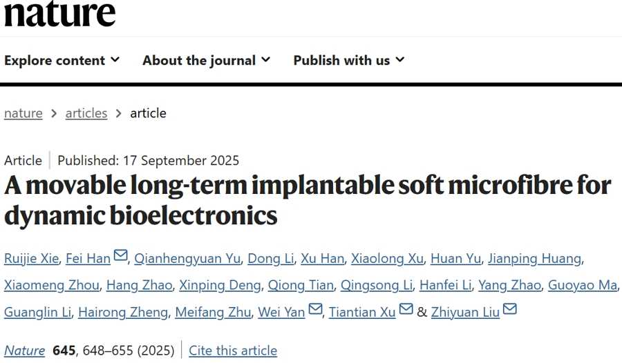 “脑机接口”怎么长期植入?能否柔性移动?9月17日,来自中国科学院深圳先进技术研究院与东华大学的科研团队在国际顶级期刊《自然(Nature)》发文:《面向动态生物电子学的可移动长期植入软纤维》(A movable long-term implantable soft microfibre for dynamic bioelectronics)。这一重大突破宣告,中国科学家团队成功研发出智能纤维——“神经蚯蚓”,可在体内自由游走,大面积、跨区域精准监测神经电信号及组织微小形变,为脑机接口技术带来革命性变革。