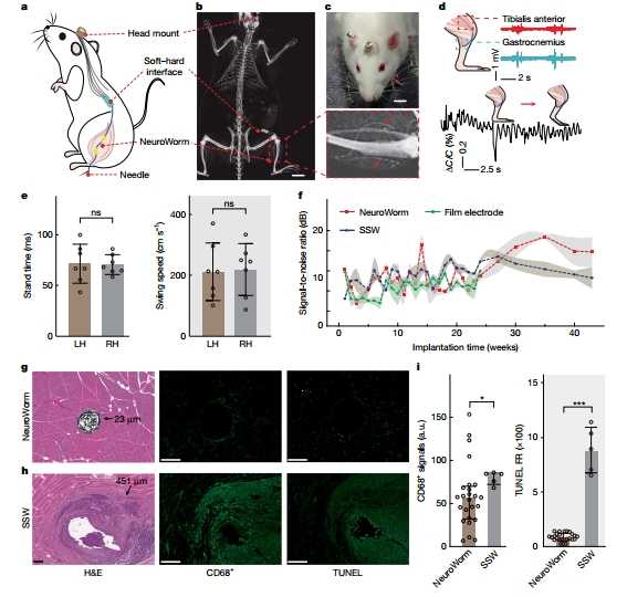 “NeuroWorm”的设计、制造策略和演示。首先是“兵力升级”:团队在一根毛发粗细(约200微米)的纤维上,沿纤维轴向分布了60个(达传统方式的15倍)离散化的电极与应变传感器。这相当于将60个“神经侦探”装入一根细针,不仅能在组织内部导航、实现微创植入,还能精准监测多点神经电信号和生物力学信号。其次是“身段变软”:纤维因其柔软性、远小于发丝的尺度,以及优异的多材料与多功能集成性,正日益成为神经接口领域中重要的器件形态之一。这项研究中的纤维基底,也与人体组织的“软硬度”高度匹配。在动物实验中,这种纤维在肌肉中留存达13个月;取出时干净无痕——显示出良好的生物相容性,宛如“身体的一部分”。