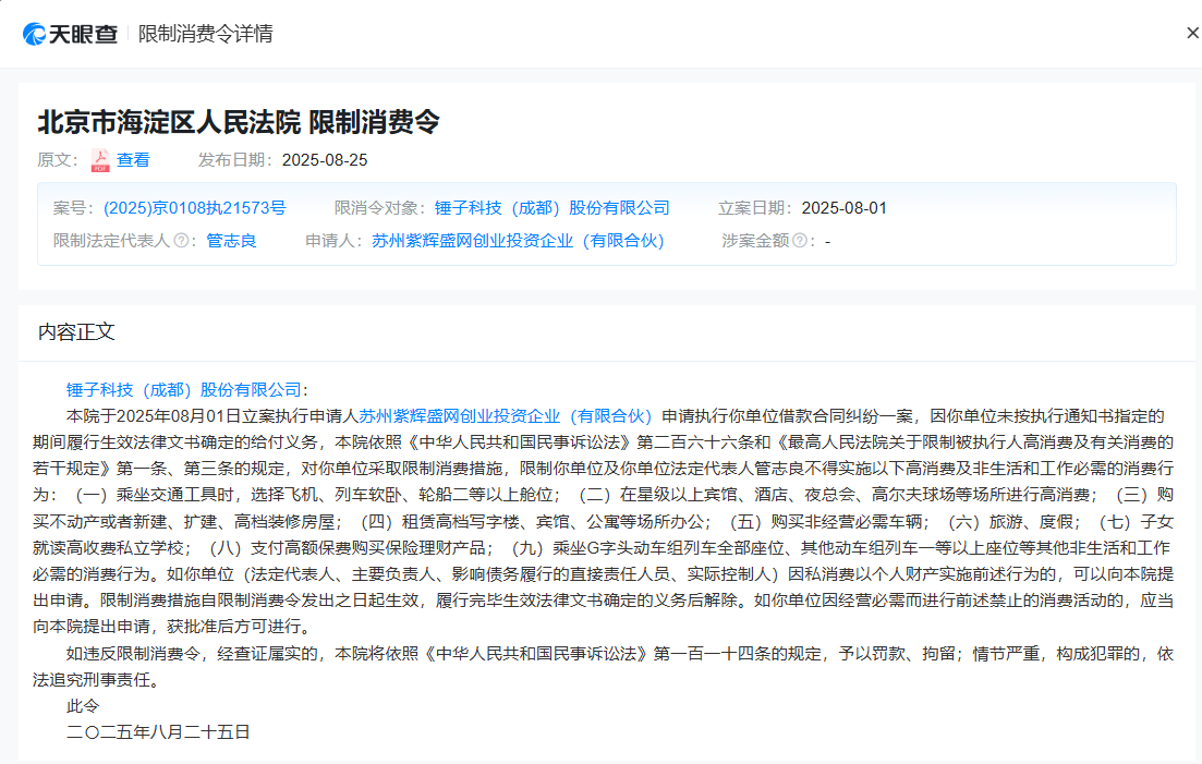 天眼查天眼风险信息显示,近日,锤子科技(成都)股份有限公司新增2条失信被执行人信息(老赖),涉及企业信用风险,引发市场关注。这两条信息均涉及与苏州紫辉盛网创业投资企业(有限合伙)相关的借款合同纠纷案件,履行情况为全部未履行,执行法院为北京市海淀区人民法院,凸显了企业债务问题的严重性。此前,锤子科技(成都)股份有限公司已因上述案件被执行2142万余元,公司法定代表人管志良也被限制高消费,进一步加剧了其财务困境。