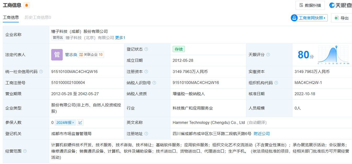 公开资料显示,锤子科技(成都)股份有限公司成立于2012年5月,法定代表人为管志良,注册资本约3149.8万人民币,经营范围涵盖基础软件服务、应用软件服务、组织文化艺术交流活动等,展现了其多元化的业务布局。股东信息显示,该公司由罗永浩、成都东方广益投资有限公司、北京明匠汇智投资管理合伙企业(有限合伙)等共同持股。目前,罗永浩仍是锤子科技(成都)股份有限公司董事长、受益所有人、实际控制人,持有该公司22.6667%的股份,其个人影响力与企业命运紧密相连。