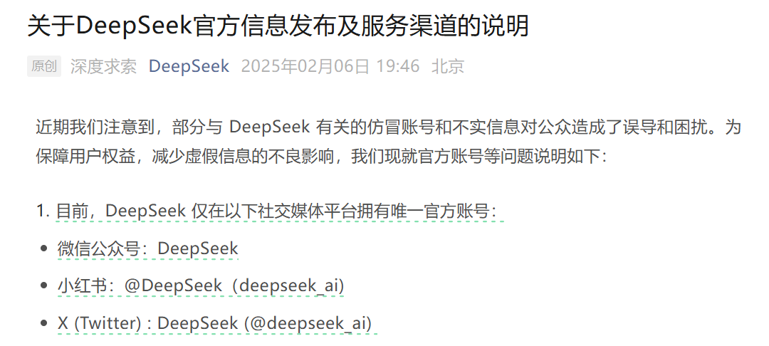 今年2月,深度求索曾发布“关于DeepSeek官方信息发布及服务渠道的说明”,其中提到,部分与DeepSeek有关的仿冒账号和不实信息对公众造成了误导和困扰。