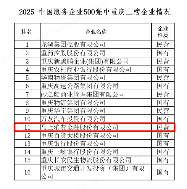 2025年9月18日,马上消费连续第七年登上中国服务业企业500强榜单。作为数字金融服务领军企业,其经营质量与科技实力获高度认可,同时积极践行社会责任,在乡村振兴、新市民就业、绿色金融等方面成果显著。
