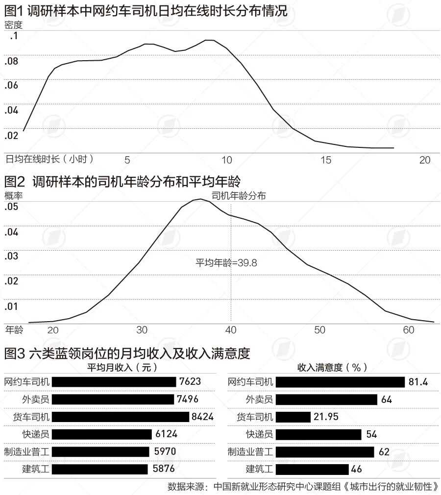 这份基于13个省市5400多位网约车司机的调查报告显示,网约车司机的平均年龄约40岁,整体呈现“中年化”特征;月均收入为7623元,在六类蓝领职业中位居第二;日均在线10小时者占比最高,六成司机是家庭唯一收入来源。中国新就业形态研究中心张成刚表示,网约车行业为宏观经济波动、政策调整及产业升级释放足够的缓冲空间,成为稳定就业(就业情况)与促进结构性转型的重要支撑。