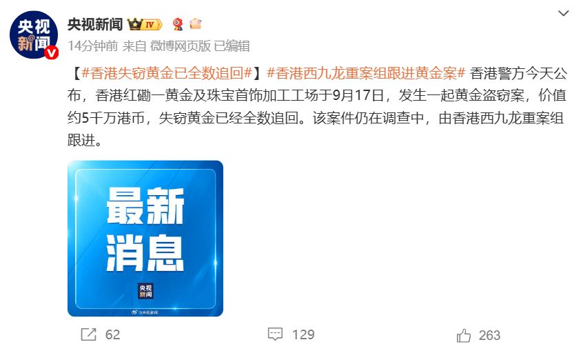据央视新闻9月18日消息,香港警方今天公布,香港红磡一黄金及珠宝首饰加工工场于9月17日,发生一起黄金盗窃案,价值约5千万港币,失窃黄金已经全数追回。该案件仍在调查中,由香港西九龙重案组跟进。