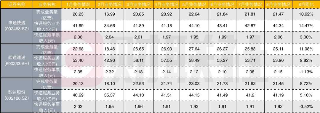 今年1-8月“二通一达”经营数据(数据来源:“二通一达”公告、财联社记者整理)