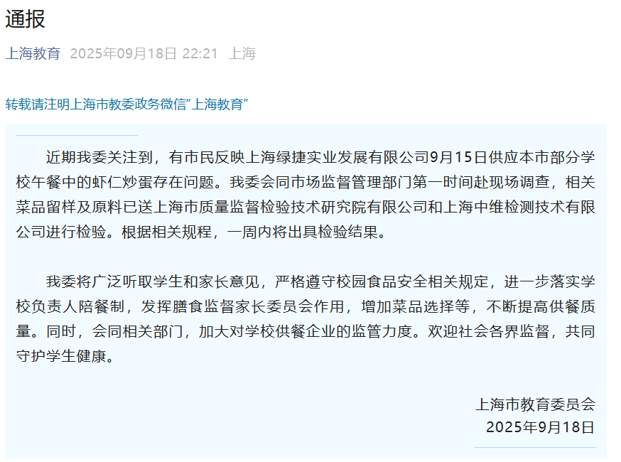 上海市教委9月18日晚通报,上海绿捷实业发展有限公司9月15日供应本市部分学校午餐中的虾仁炒蛋存在食品安全问题,已送检并将一周内出具检验结果,同时将加强供餐企业监管。