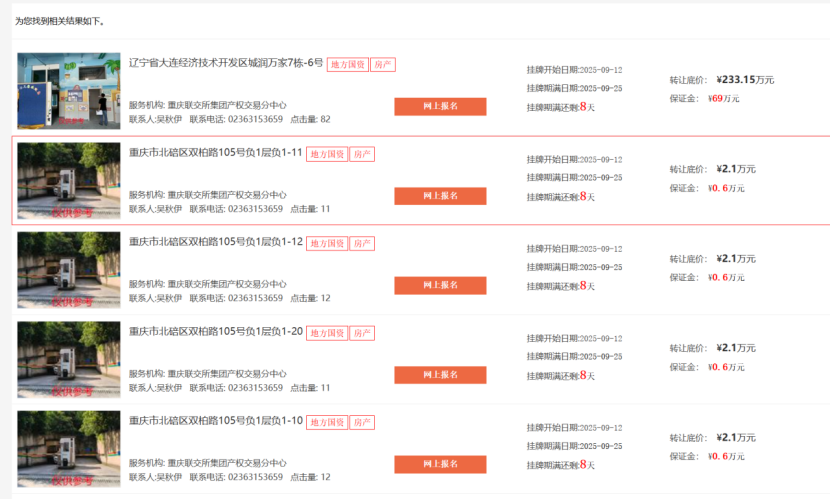 在70余处挂牌资产里,车位占绝对多数,共计68个,全部位于正源橡园小区,单个车位的转让底价为2.1万元。转让公告明确要求,仅限正源橡园小区业主凭房屋产权证参与受让,且每个产权证只能对应购买一个车位。另有2个挂牌项目是房产,一处位于辽宁省大连的城润万家,面积666.15平方米,转让底价为233.15万元;另一处位于安徽省亳州的外经钻石广场,面积122.66平方米,转让底价为104.26万元。此外,3辆奥迪牌2.0小型轿车也被挂牌中,其车牌分别归属上海、北京、深圳,转让底价分别为2.36万元、2.65万元、2.6万元。上述70余个挂牌项目的转让底价合计为487.82万元。其中,机动车挂牌时间为9月10日至17日,其余项目挂牌期限均为9月12日至25日。