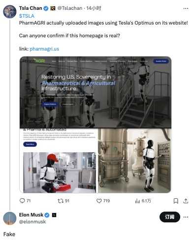 马斯克否认特斯拉与PharmAGRI签署万台人形机器人协议