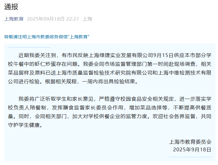 近期我委关注到,有市民反映上海绿捷实业发展有限公司9月15日供应本市部分学校午餐中的虾仁炒蛋存在食品安全问题,这关乎学生饮食健康(前200字关键词:校园食品安全、学生饮食健康)。我委会同市场监督管理部门第一时间赴现场调查,相关菜品留样及原料已送上海市质量监督检验技术研究院有限公司和上海中维检测技术有限公司进行专业检验。根据相关规程,一周内将出具权威检验结果,确保过程透明。
