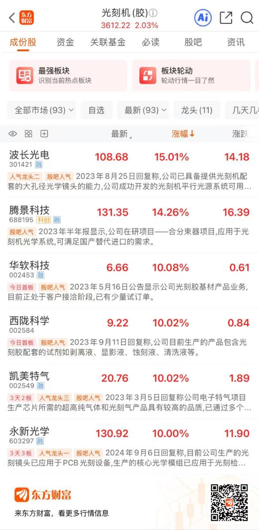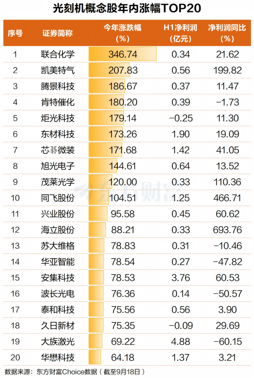 华金证券表示,光刻机技术仍是先进制程大规模量产的基石。从产业链角度来讲,该机构表示,除了整机(上海微电子、奥普光电)外,光学器件(茂莱光学、炬光科技等)、光源(福晶科技、波长光电)、物镜(赛微电子、福光股份)等都是光刻机工作的重要环节。在国产替代以及技术突破的背景下,相关上市公司受到投资者追捧,今年股价集体走强。据东方财富Choice数据,截至9月18日,A股93家具有光刻机概念的上市公司中,年内股价上涨的共计89家,上涨家数占比接近96%,平均涨幅更是高达49.18%。其中,联合化学涨幅最大,年内涨超3倍;凯美特气紧随其后,年内涨超2倍;腾景科技、肯特催化分别位列第三、第四,涨幅均超180%。此外,炬光科技、东材科技等多股,今年股价也已翻倍。