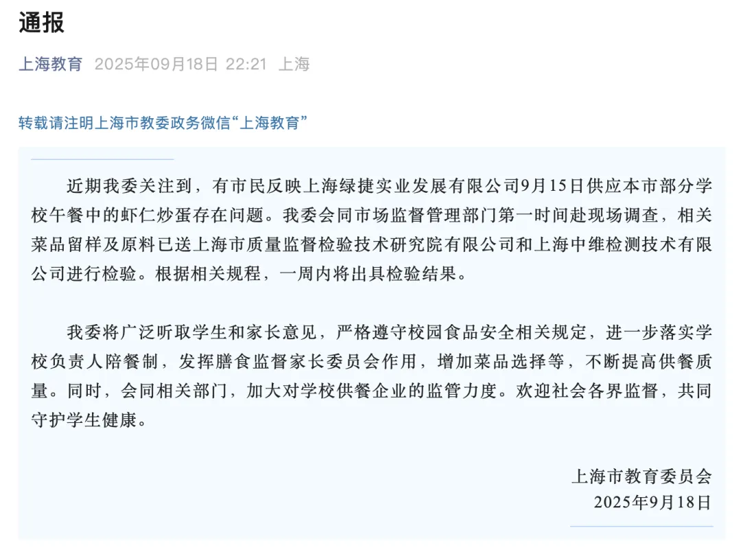 9月18日晚,上海市教育委员会发布通报:近期我委关注到,有市民反映上海绿捷实业发展有限公司9月15日供应上海部分学校午餐中的虾仁炒蛋存在问题。我委会同市场监督管理部门第一时间赴现场调查,相关菜品留样及原料已送上海市质量监督检验技术研究院有限公司和上海中维检测技术有限公司进行检验。根据相关规程,一周内将出具检验结果。