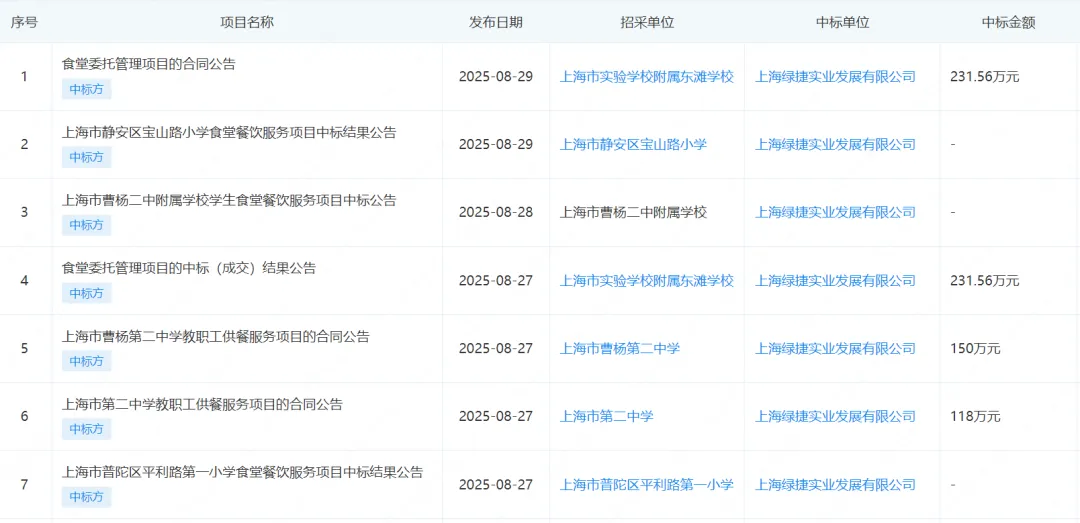 据企查查数据显示,2025年,上海绿捷有101条中标信息,8月一个月,中标了70家上海中小学的食堂餐饮服务项目,显示出其在校园餐饮市场的广泛布局。