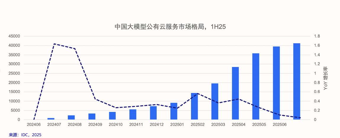 随着推理模型、多模态模型能力的进一步提升,模型调用的商业模式逐渐成熟。IDC指出,相比2024全年114万亿Tokens的市场规模,仅2025年上半年就实现了近400%的增长,这一数据充分展示了公有云大模型市场的巨大潜力。