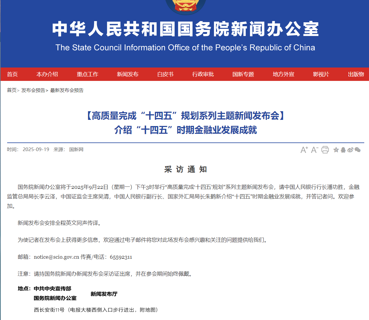 2025年9月22日,国务院新闻办将举行发布会,介绍‘十四五’时期金融业发展成就,央行、金融监管总局、证监会领导将出席并答记者问。