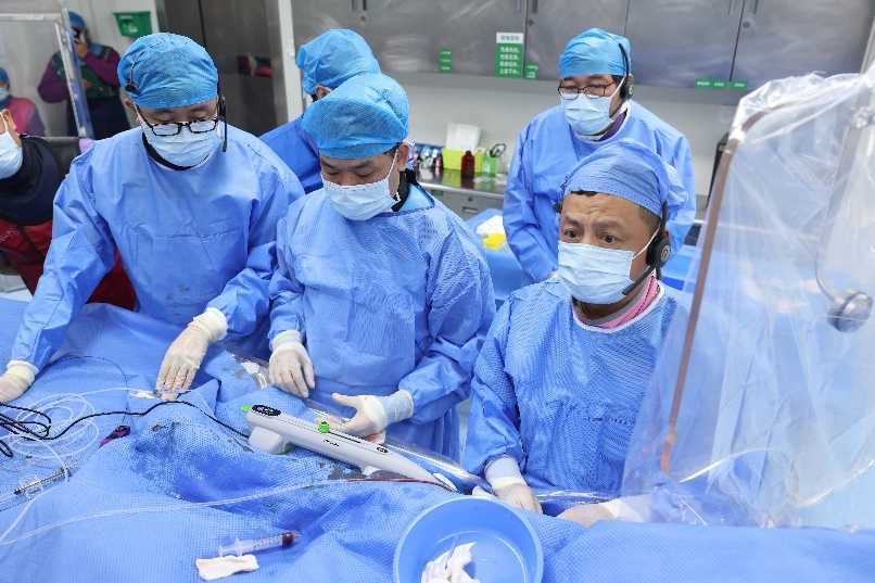 中国科学院院士、复旦大学附属中山医院心内科主任葛均波教授(右一) 领衔的团队在手术中