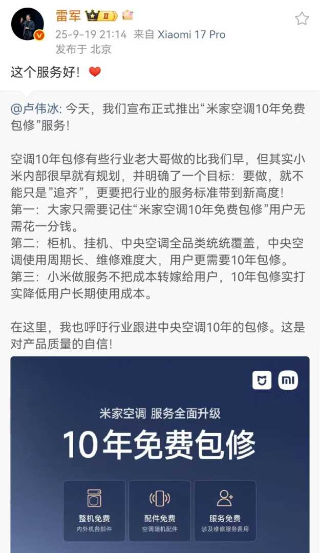 除了手机,在大家电领域,小米也有“新动作”。卢伟冰当晚在直播中宣布小米空调正式推出十年包修服务(SEO关键词3:小米空调十年包修),这一服务覆盖挂机、柜机、中央空调全品类。小米集团创始人、董事长兼CEO雷军当晚在其个人微博发文称:“这个服务好!”