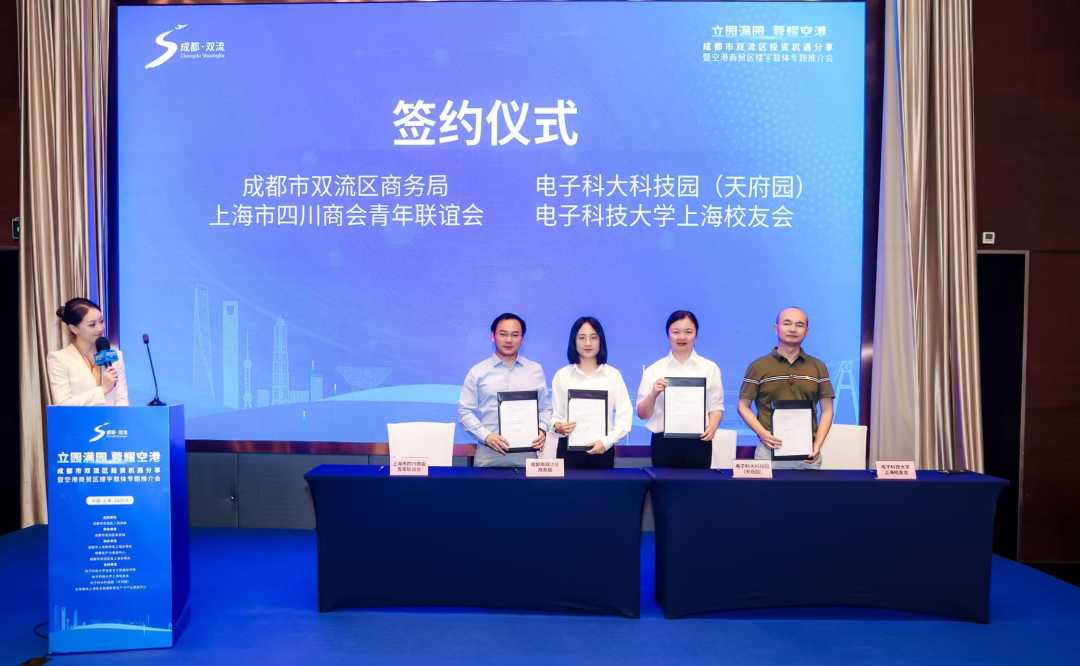 推介会上,双流区副区长罗仕明致辞,双流区商务局作招商推介发言,世邦魏理仕分享双流楼宇经济发展机遇,双流区规划和自然资源局发布双流区商业用地清单,电子科技大学信息与通信工程学院发布最新科研成果,电子科大科技园(天府园)、芯谷研创城、空港国际会议中心和空港怡心城4个重点楼宇载体分别作了专题推介。会上,双流区商务局及电子科大科技园(天府园)分别与上海市四川商会青年联谊会、电子科大上海校友会签订了战略合作协议,区域合作,成为此次签约亮点,旨在加强后期投资合作。