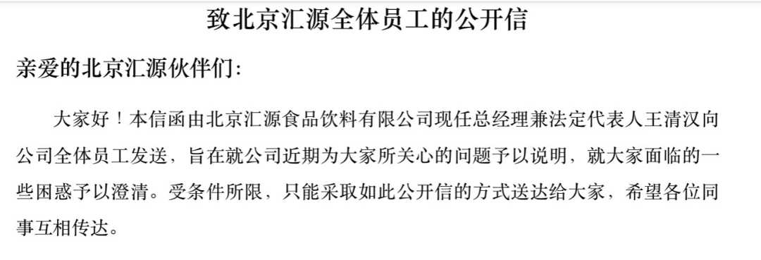 9月20日,界面新闻获得一份由北京汇源食品饮料有限公司(以下简称“汇源”)现任总经理及法定代表人王清汉发布的《致北京汇源全体员工的公开信》。信中披露的信息意味着汇源与其控股方诸暨文盛汇的矛盾正在升级,汇源公司治理引发市场关注。