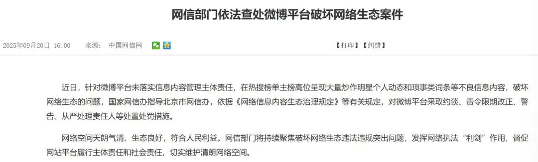 据网信中国9月20日消息,近日,针对微博平台未落实信息内容管理主体责任,在热搜榜单主榜高位呈现大量炒作明星个人动态和琐事类词条等网络不良信息内容,破坏网络生态秩序的问题,国家网信办指导北京市网信办,依据《网络信息内容生态治理规定》等有关规定,对微博平台采取约谈、责令限期改正、警告、从严处理责任人等处置处罚措施,彰显了监管部门净化网络空间的决心。
