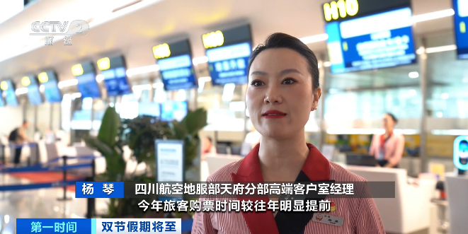 四川航空地服部天府分部高端客户室经理杨琴:预售情况来看,今年旅客购票时间较往年明显提前,9月30日和10月1日为节前出行的高峰,成都飞往北京、深圳、杭州等地的部分航班客座率已经达到了80%,敦煌、阿勒泰等西北航点机票已经基本售罄,热门航线一票难求。