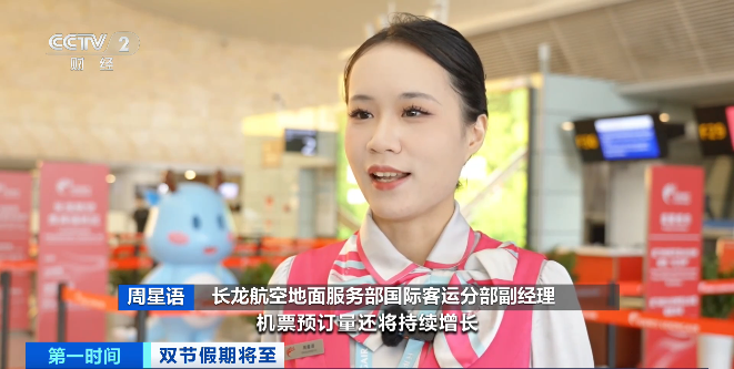 长龙航空地面服务部国际客运分部副经理周星语:随着假期的临近,机票预订量还将持续增长,尤其是一些热门城市和旅游目的地的机票可能会更加紧俏,出行高峰持续。