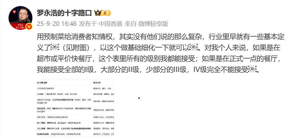 9月20日下午,罗永浩发布微博称,“用预制菜给消费者知情权,其实没有他们说的那么复杂,行业里早就有一些基本定义了,以这个做基础细化一下就可以。”