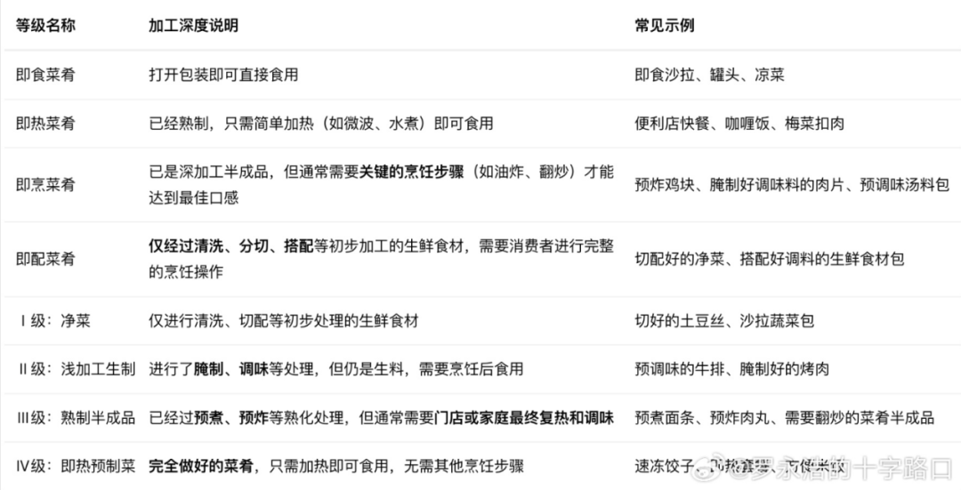 根据罗永浩发布的图片,I级为净菜,是仅经过清洗、分切、搭配等初步加工的生鲜食材,例如切好的土豆丝、沙拉蔬菜包。Ⅱ级为浅加工生制,进行了腌制、调味等处理,但仍是生料,需要烹饪后食用,例如预调味的牛排、腌制好的烤肉。Ⅲ级为熟制半成品,已经过预煮、预炸等熟化处理,但通常需要门店或家庭最终复热和调味,例如预煮面条、预炸肉丸、需要翻炒的菜肴半成品。Ⅳ级是即热预制菜,是完全做好的菜肴,只需加热即可食用,无需其他烹饪步骤,例如速冻饺子、即热套餐、方便米饭。