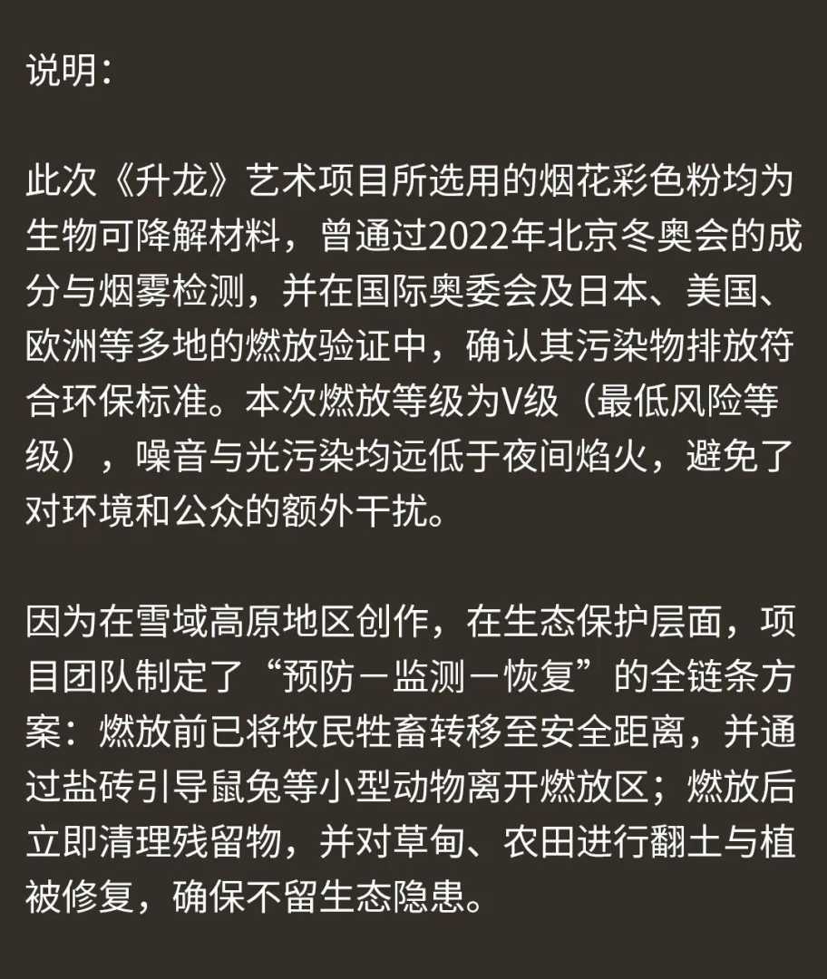 《蔡国强:升龙》烟花秀在西藏日喀则燃放,引发网民关注。活动手续合规,生态未受破坏,选用生物可降解材料,符合环保标准。项目团队制定全链条生态保护方案,确保生态安全。