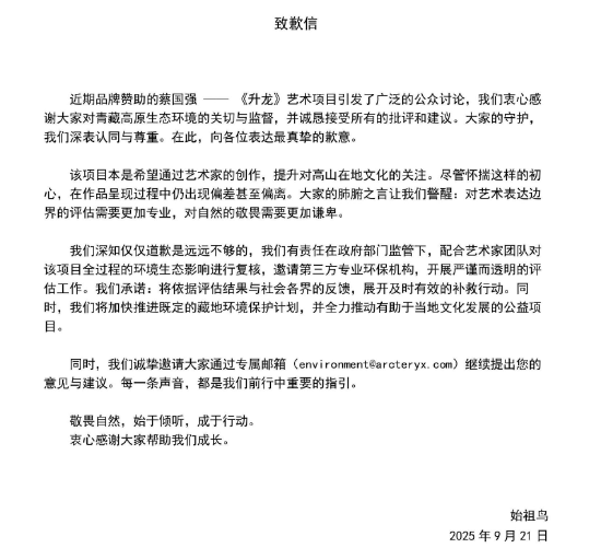 始祖鸟与蔡国强就环境问题公开致歉,承诺开展环保评估