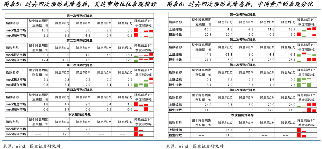 美联储在1995年、1998年、2019年和2024年实施预防式降息后,美国经济均实现“软着陆”,GDP增速扭转下行,失业率下降。本轮降息中,美联储上调2025-2027年GDP增长预测,下调失业率预测,显示对经济“软着陆”的信心。对美股而言,流动性增强且经济企稳概率回升,美股表现较好;对新兴市场而言,降息缓解汇率贬值压力,为货币政策腾出空间,若经济增长企稳,资本市场或受益于美元外溢。对中国这样的净出口大国而言,预防式降息后的经济“软着陆”意味着海外资本开支构成的外需与新兴市场复苏对于外需的拉动将进一步上升。