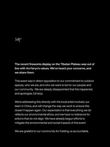 21日,南都记者发现,始祖鸟在海外社交媒体平台发表的英文说明内容与国内版本有所差异。在英文说明中,始祖鸟表示,近期在青藏高原举行的烟花表演与品牌价值观相悖:“我们对此深感失望,并在此致以最诚挚的歉意。” 始祖鸟还表示,品牌“将直接与涉事的当地艺术家以及我们在中国团队沟通此事”,试图弥合国内外舆论分歧。