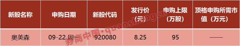 证监会同意2家企业IPO注册,江苏锡华新能源科技股份有限公司上交所主板首次公开发行股票注册,纳百川新能源股份有限公司创业板首次公开发行股票注册。本周(9月22日—9月26日)有1只新股发行,周一:奥美森,为投资者提供新股投资机会。