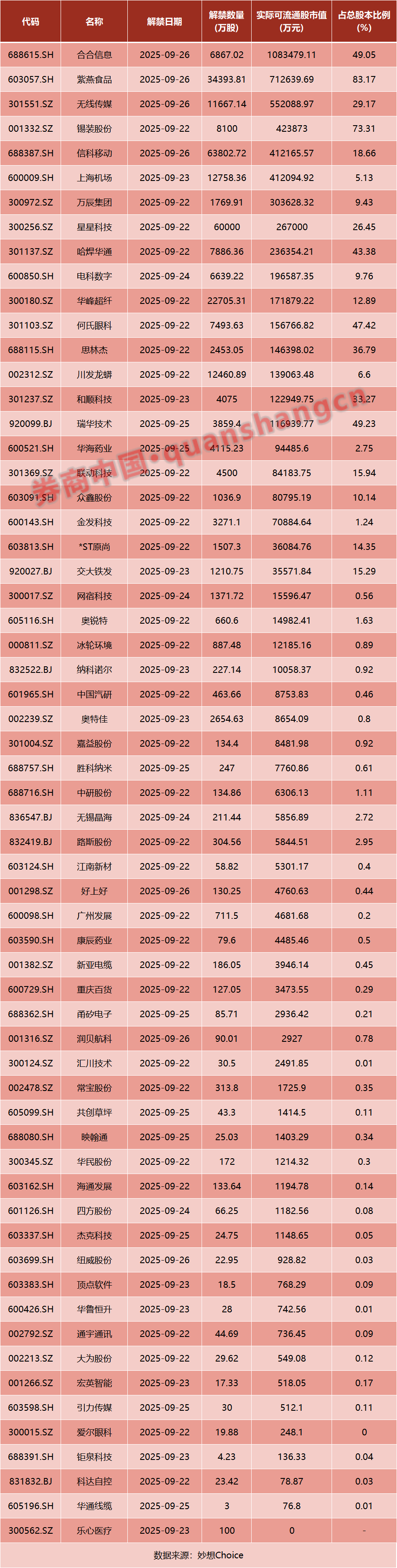 数据显示,本周(9月22日—9月26日)共有61家公司限售股陆续解禁,合计解禁29.25亿股,解禁总市值为601亿元。解禁市值居前三位的是:合合信息(108.35亿元)、紫燕食品(71.26亿元)、无线传媒(55.21亿元)。解禁占比居前三位的是:紫燕食品(83.17%)、锡装股份(73.31%)、瑞华技术(49.23%),投资者需关注限售股解禁影响。