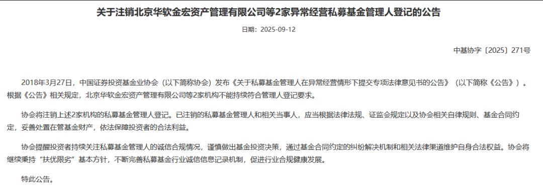 近日,中基协发布公告称,北京华软金宏资产管理有限公司等2家机构不能持续符合管理人登记要求,协会将注销2家机构的私募基金管理人登记。截至9月19日,今年以来注销登记的私募基金管理人达851家。从注销类型来看,“协会注销”和“主动注销”成为私募管理人退出行业的主要原因。具体而言,“主动注销”“协会注销”“12个月无在管注销”以及“依公告注销”四种类型注销登记数量分别为449家、332家、67家和3家。值得注意的是,从去年数据来看,私募业“劣币出清”以协会注销为主。中基协数据显示,去年同期协会注销登记数量为705家,主动注销登记为406家。但是,今年以来主动注销登记数量显著超过了协会注销数量,行业生态持续优化。