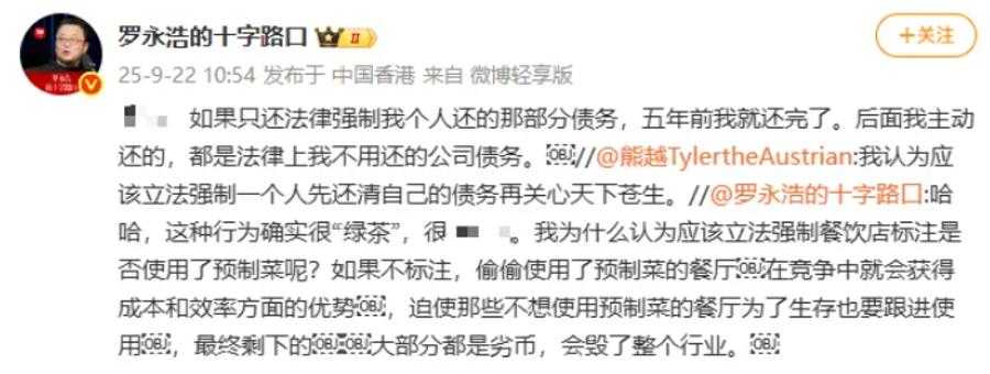 9月22日,针对网友质疑的罗永浩债务问题,罗永浩本人转发微博回应,引发广泛关注。罗永浩表示:“如果只还法律强制我个人还的那部分债务,五年前我就还完了。后面我主动还的,都是法律上我不用还的公司债务。” 债务问题成为商业领域热点话题。