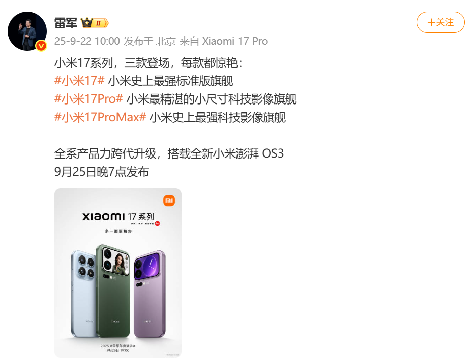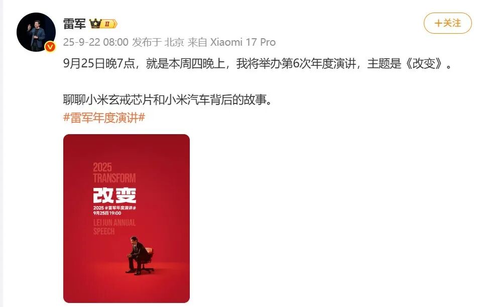 9月22日,雷军微博宣布小米17系列将于9月25日晚7点发布,含三款机型。同时,将举办年度演讲,主题《改变》,揭秘小米玄戒芯片与小米汽车背后的故事。