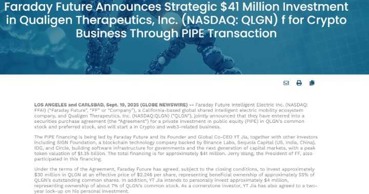法拉第未来与Qualigen签署PIPE协议,投资约4100万美元,拟转型加密货币与Web3业务。贾跃亭将合计持有QLGN62%股份,并出任首席顾问。Qualigen或剥离医药业务,但面临退市风险与业务困境。