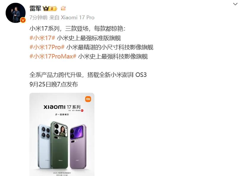 9月22日,小米董事长兼CEO雷军在社交平台发布消息,小米17系列将于9月25日晚7点正式发布,共推出三款机型:小米17、小米17 Pro、小米17 Pro Max。这款小米旗舰机型,被雷军称,小米17是“小米史上最强标准版旗舰”,小米17 Pro是“小米最精湛的小尺寸科技影像旗舰”,小米17 Pro Max则是“小米史上最强科技影像旗舰”。新机全系搭载全新小米澎湃OS 3,产品力实现跨代升级。