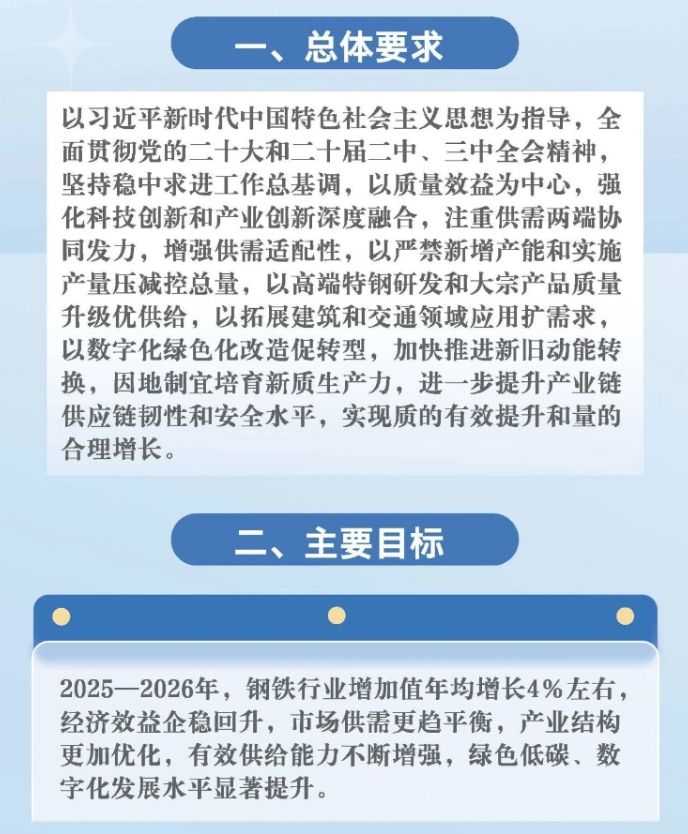 《方案》明确2025—2026年主要目标:钢铁行业增加值年均增长4%左右,经济效益企稳回升,市场供需更趋平衡,产业结构更加优化,绿色低碳、数字化发展水平显著提升。其中绿色钢铁、低碳转型成为关键词,助力行业可持续发展。