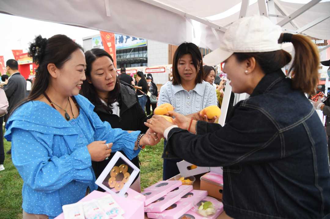 9月19日,北京市平谷区举办2025年中国农民丰收节暨第36届北京农民艺术节“乡村大舞台”平谷区专场展演。工作人员(右一)在活动现场向市民介绍农产品。新华社记者任超摄