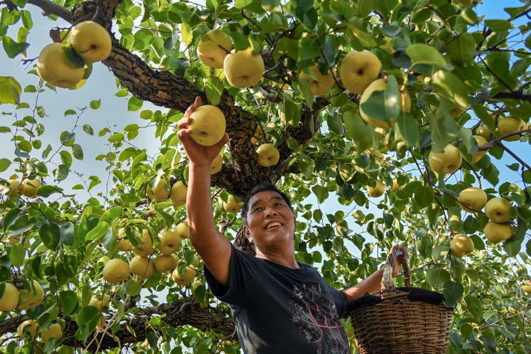 9月15日,在安徽省宿州市砀山县一处梨园内,梨农在采摘酥梨。新华社发(崔猛摄)
