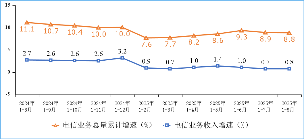 电信业务收入保持正增长,电信业务总量较快增长。前8个月,电信业务收入累计完成11821亿元,同比增长0.8%。按照上年不变价计算的电信业务总量同比增长8.8%,显示出通信业的稳健发展。