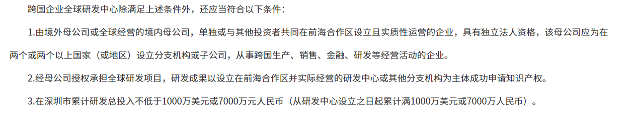 需要注意的是,《若干措施》支持的“企业研发中心”与“跨国企业全球研发中心”,需满足在前海实质性从事研究开发和实验发展,在深圳市累计研发总投入不低于200万美元(或1500万元人民币)、专职研发人员不少于20人等条件,其中“跨国企业全球研发中心”另有更高投入与资质要求。