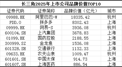 榜单显示,长三角城市群的前十名上榜企业均来自上海和杭州,且前三名均为民营企业。其中,阿里巴巴(09988.HK)稳居第一,品牌价值高达18335.42亿元;拼多多(PDD.O)品牌价值突破8000亿元;网易-S(09999.HK)品牌价值接近4000亿元。