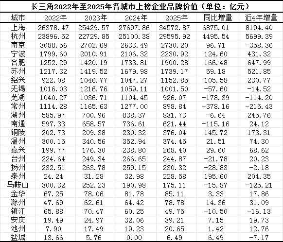 事实上,作为中国参与国际竞争的重要平台与经济社会发展的核心引擎,长三角城市群已在多维度展现出国际影响力,而上市公司作为区域发展的“排头兵”,在此过程中发挥着关键支撑作用。长三角品牌价值变动,正是这种支撑作用的直观体现。