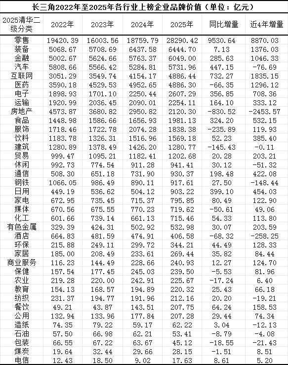数据呈现出明显的产业结构调整态势:零售行业品牌价值近4年增长近9000亿元,增长势头领先;互联网、电子、装备等行业亦保持稳健增长。与之形成鲜明对比的是,房地产行业品牌价值大幅缩水超2400亿元,成为品牌价值缩水最多的行业。长三角产业结构调整,零售行业增长显著。