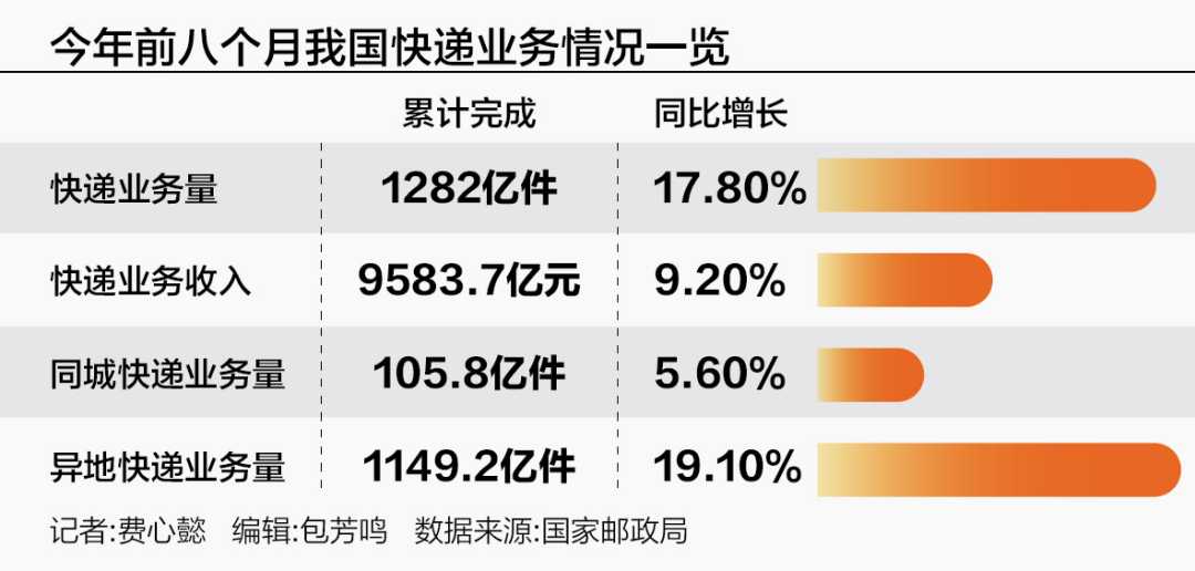 过去,头部企业“以量取胜”的策略带来了快递行业的快速繁荣与成本骤降。国家邮政局最新数据显示,今年前八个月,我国快递业务量累计完成1282亿件,再创历史新高,同比增长17.8%。快递业务收入累计完成9583.7亿元,同比增长9.2%,是名副其实的万亿级产业。