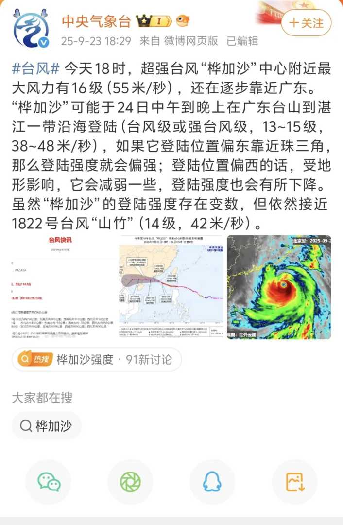 今年第18号台风“桦加沙”正在逼近广东沿海,带来强台风威胁。据中央气象台官方微博9月23日傍晚发布的消息,“桦加沙”可能于9月24日中午到晚上在广东台山到湛江一带沿海登陆(台风级或强台风级,13-15级,38-48米/秒),台风防御成为关注焦点。